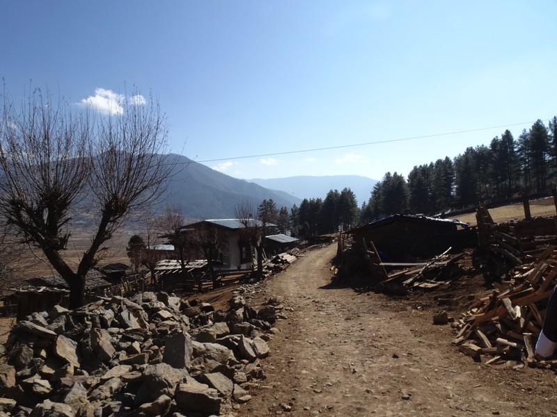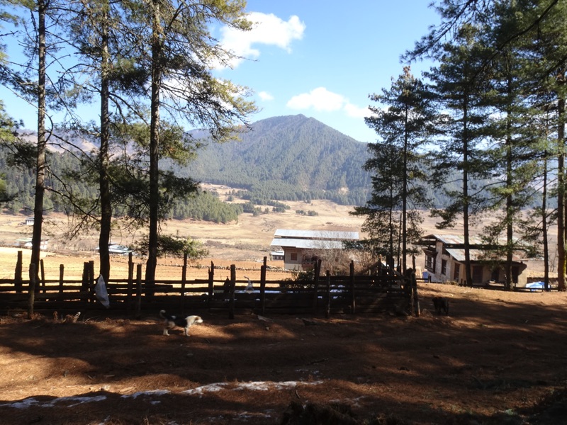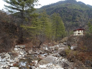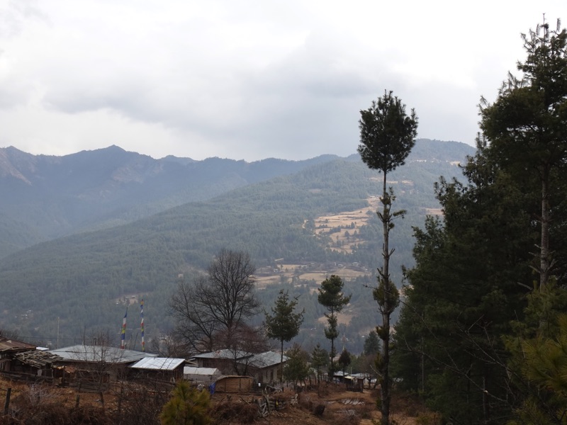 We settled back in our room and unpacked a bit. Then, we took a hike in the pine forest across the valley on a trail offering views of the valley and one of the dzongs. We passed through forest, crossed streams, slogged through mud and snow, then descended along a country road through a farming village. We were properly tired when we turned up for a last Bhutanese dinner at Amankora Bumthang.