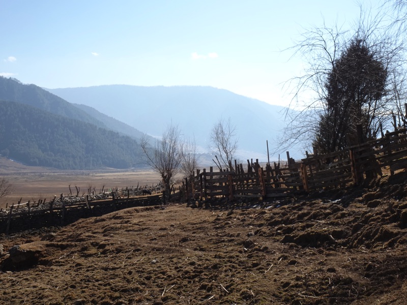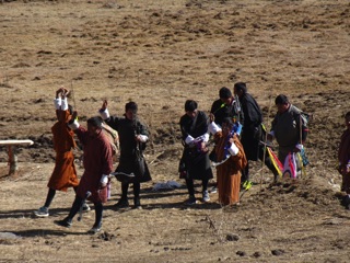 We took a longer walk, this time to the Crane Center which has exhibits explaining the lives of the black necked cranes and the efforts being made to preserve them. We walked through farm country and pine forest. There were cranes out foraging and archers practicing. Archery is like pick up basketball in Bhutan. A bunch of guys get out with their bows and arrows and shoot a few. Here, they were using compound bows, and there were a number of bullseyes, each worth two points and accompanied by a bit of celebration. Apparently, one of the archers we saw is the best archer in Bhutan.