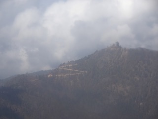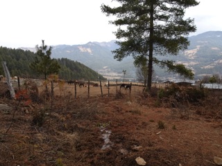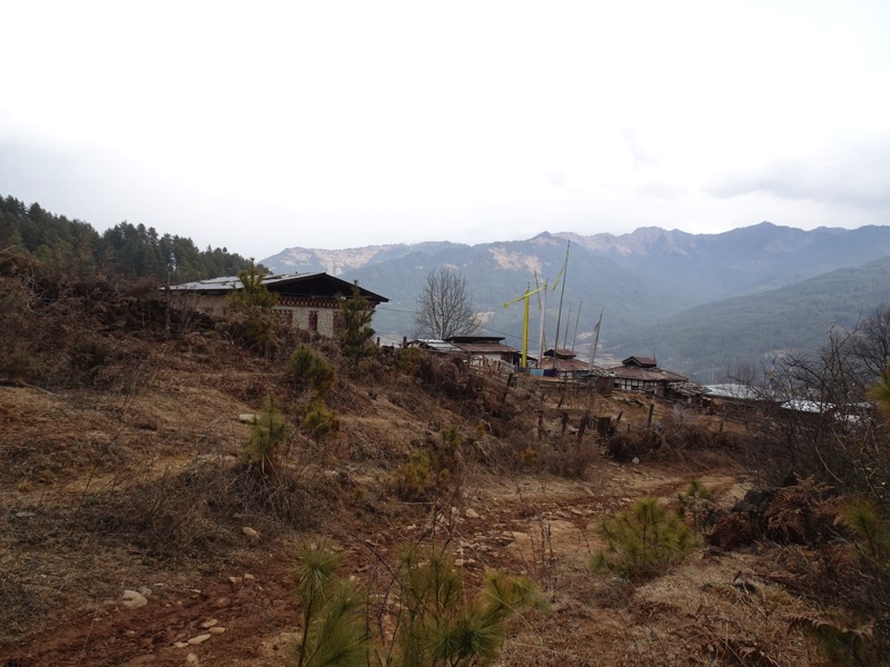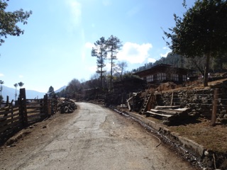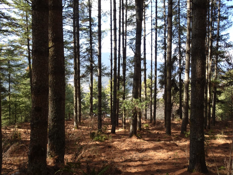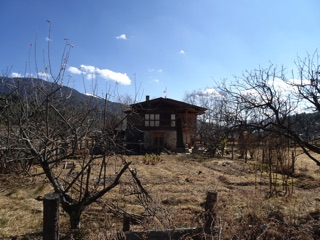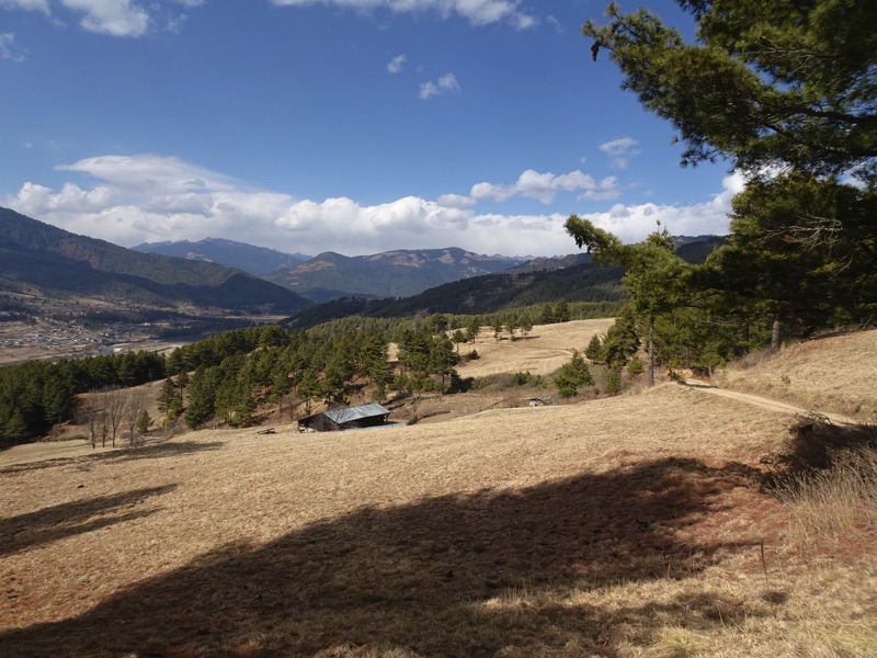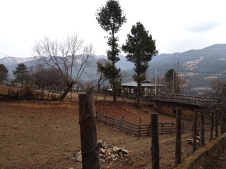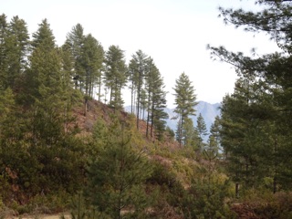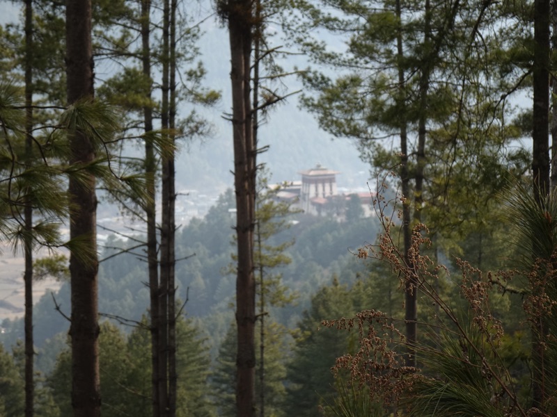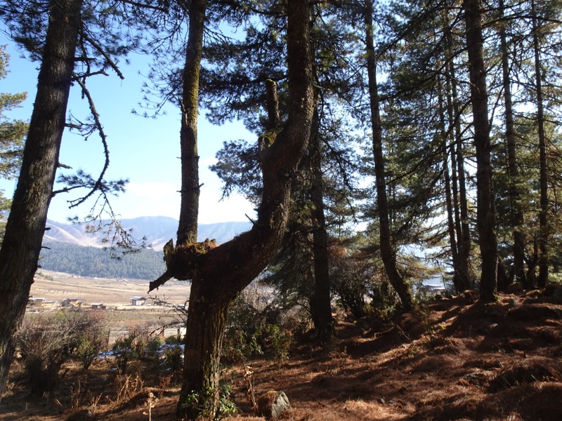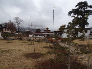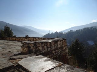 We took a longer hike on our first day in Bumthang. After the long ride the day before, we needed to stretch our legs. We started in farm country overlooking a convent and made our way into the hills. There was snow on the ground here and there and frozen water. There were pine needles carpeting the forest floor. We had glimpses of the valley and the mountains beyond. We climbed for a fair way, almost 1200’ from the trailhead, then we stopped for a rest. Then we descended through more pine forest before emerging just above town. We could even see our hotel down below us. As is so often the case in the mountains, things that seem nearby are often quite far away by foot or even car. We were glad when the trail met the road and we descended to meet our driver for the ride home.