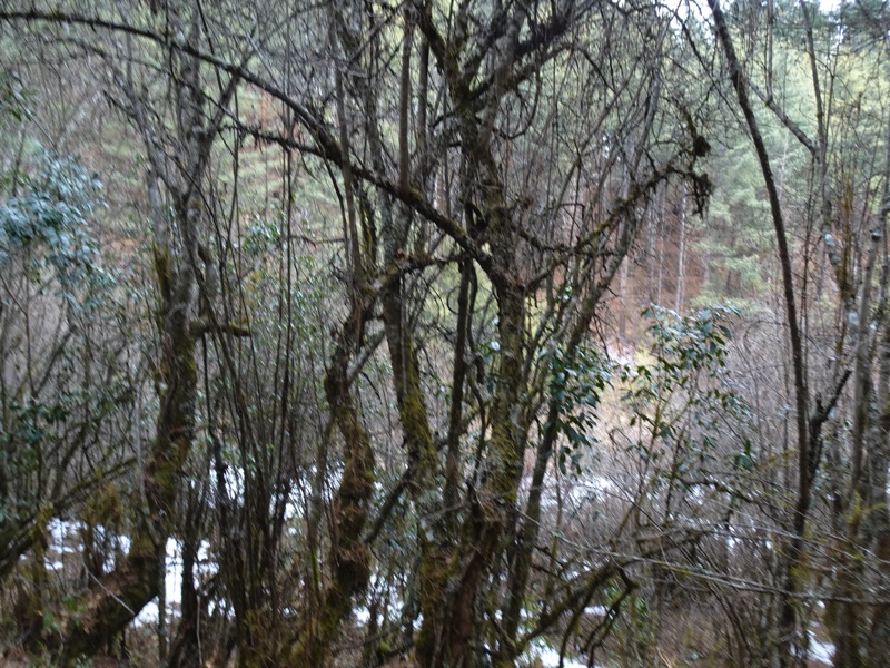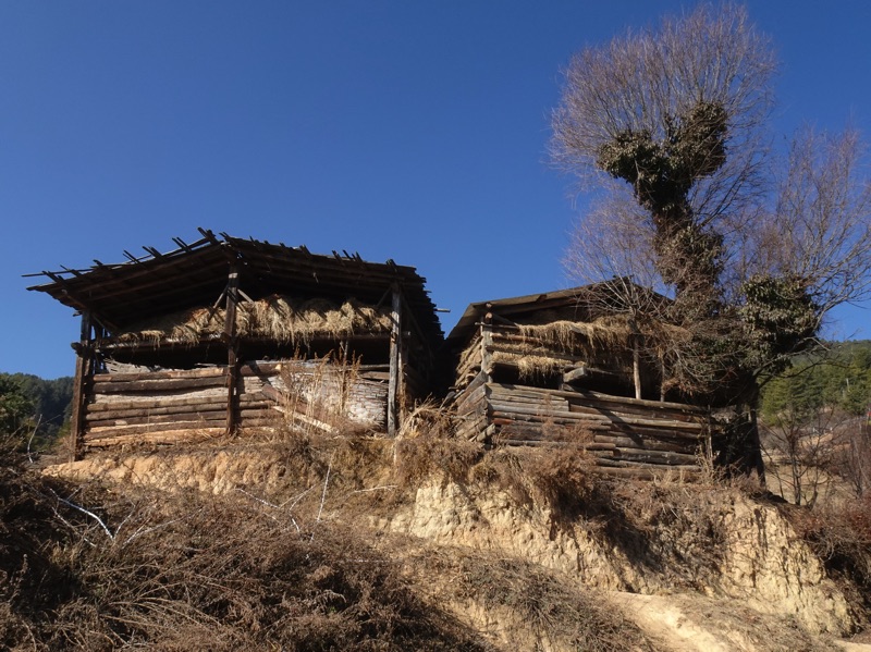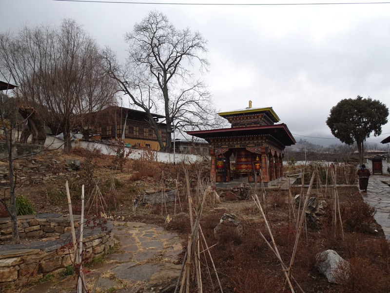 It was drizzling as we started our climb, and it turned into what Wunderground called winter mix as we ascended. That's drizzle, flurry and light sleet. We crossed streams twice, and the winter mix turned into snow with a light accumulation. Then we approached terraced fields and a small farming village, maybe a few houses, more a hamlet than a village. There was a water powered prayer wheel and a farmer hard at work collecting tried turnips which had been spread about the field. The dominant color was brown, but there were green daikon leaves and even a small tomato vine running along the stone wall of the terrace.