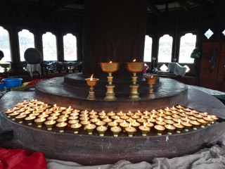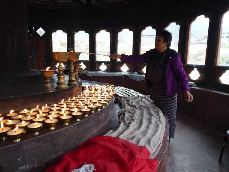 We made a traditional Bhutanese butter offering at one of the temples in Paro. We lit 108 butter based candles. One hundred and eight is an auspicious number in Bhutanese Buddhism. The offering pavilion was cold when we started, each of us lighting half of the candles. We focused on our task, lighting each candle in turn. Slowly, the space filled with light followed by warmth. When we had finished, the whole aspect of the space had changed from dark and cold to warm and light.