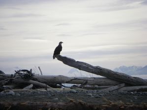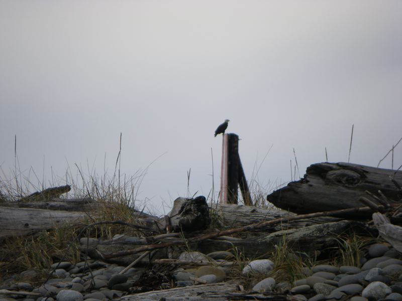 There were two bald eagles, maybe a dozen yards apart, perched on the driftwood on the high ground of the spit. The older eagle took off shortly after we started taking pictures, but the young eagle stood his or her ground.