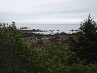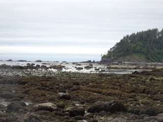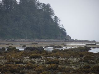 The beach itself is at the end of the earth. We made our way down and were pleasantly surprised. The waters of the Pacific were still a fair ways off, but we were on the water's edge following a good path of sand, stones and dried out seaweed. We headed south towards Sand Point, but all too soon the trail dissolved into large rocks and small stones decorated with wet seaweed. It was rough going, and we were more tired than we had thought. We gave up well before the first headland.