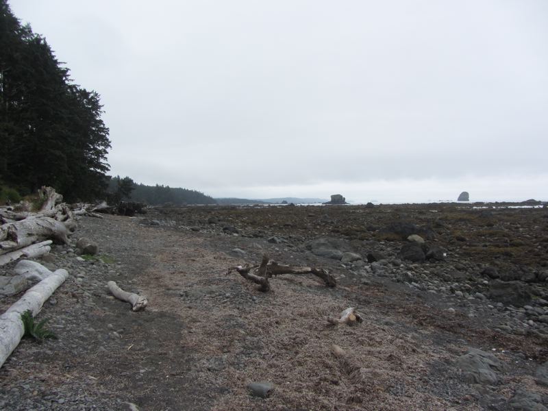 We were just out at Cape Alava and took the 9+ mile loop from the Lake Ozette ranger station to Cape Alava, then down along the beach to Sand Point, and then back inland to the ranger station. We went at a 0.5 foot low tide, but even then, it wasn't easy going, especially with all the fallen trees along the northern part of the beach hike.