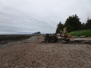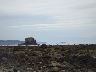 We were out at Cape Alava to take advantage of the good tides. The trail is much as we remembered it, amazingly green, rising and falling, then opening out to the meadows before descending to the sea. The park service has done some good work repairing the boardwalks which were getting a bit spotty, so the three plus mile walk from the Ozette Ranger Station to Cape Alava was easier than the last time, but the three miles along the beach from Cape Alava to Sand Point were harder. The beach was rough going with much more driftwood and much less sand. Much of the walk was on rocks and stones. At least the seaweed was dry, and nothing was very slippery. We made our way from fallen tree to fallen tree, passing through their branches like the ribs of a great carcass. There were no stretches of smooth sand until we were nearly at Sand Point.