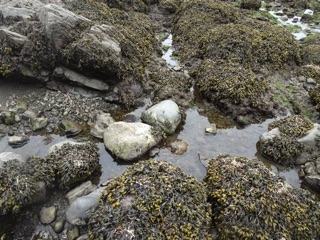 Today, the walk was easy. The tide was low, well below one foot while we were there, so it was easy to go rock hopping around the points. It was also dry, so the boardwalks weren't slippery. Finally, it wasn't too sunny, because the beach can get a bit oppressive with the full sun bouncing off the Pacific.