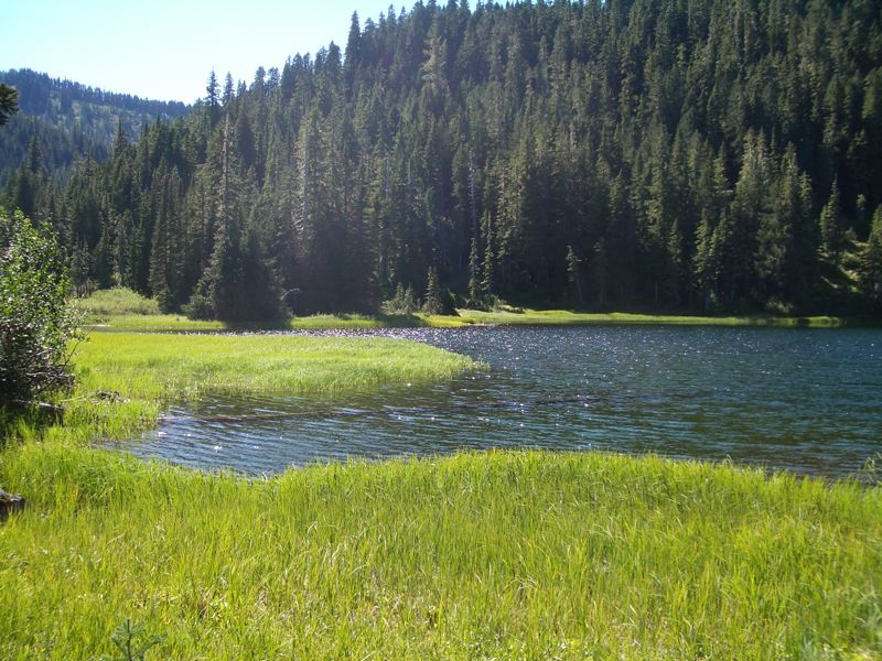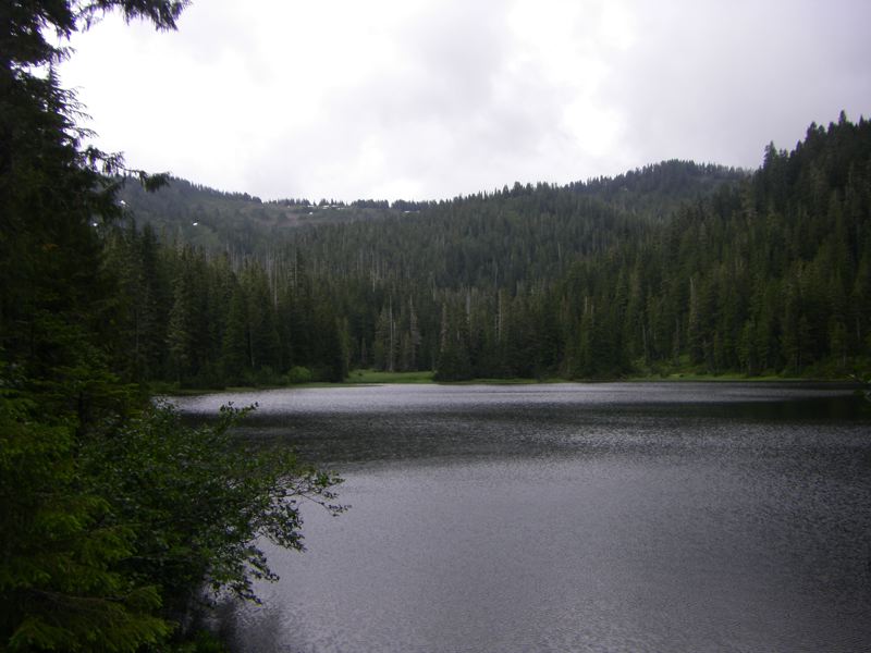 The snows have melted at Deer Lake, so we were up the trail to take a look. The weather was scattered showers, so the sky was a mix of gray and blue patches. It rained under the gray and it was warm and bright under the blue.