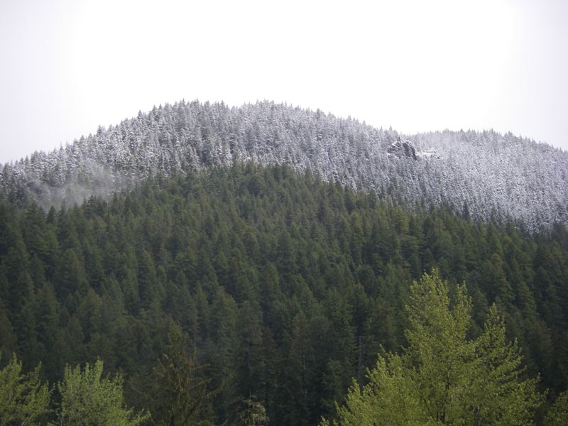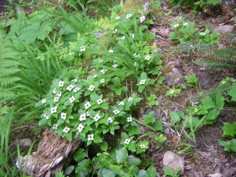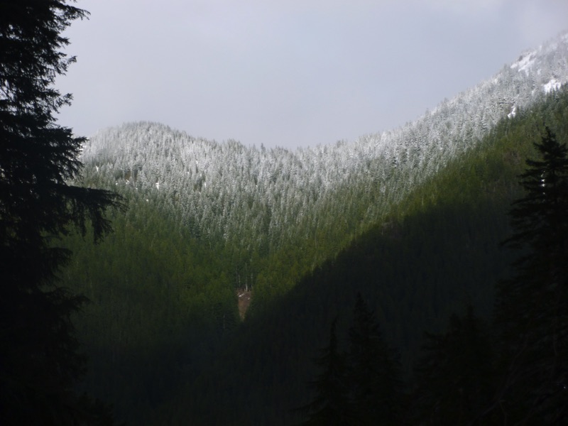 The trail was usual stony self. The air was heavy and misty, so it was hard going. The trail was wet, but not impassable. We had to stop on the bridge to marvel at the waterfall. There was a lot of Pacific dogwood in flower for the first half of the trail, and a lot of glacier lilies as we got higher.