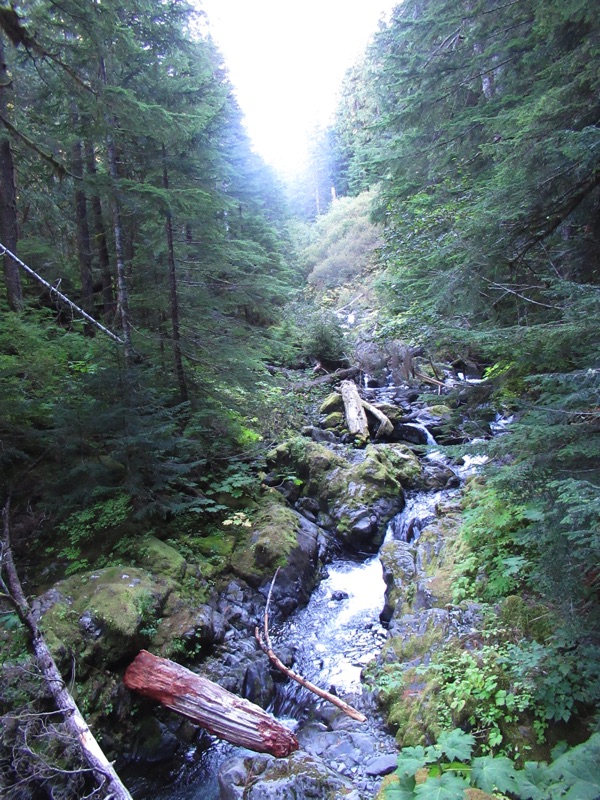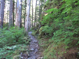 The trail to Sol Duc Falls is relatively easy going, maybe 25 minutes of hiking with some ups and downs through old growth forest. There is a bridge across the Sol Duc at the falls, and then the trail begins a slow, rough ascent. It seems that half the climbing is up and down various rocks in the trail rather than up the mountainside. The air is often close, at least until one nears Canyon Creek.