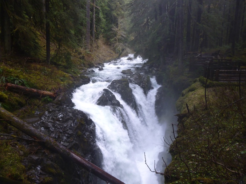 With Olympic Hot Springs Road closed, we haven’t managed to take any of the trails out of Whiskey Bend or visit the hot springs themselves lately. Instead we drove west past Lake Crescent and took the left turn at the top of the hill onto Sol Duc Road. The resort is closed, but the trail to the falls is open and free of snow.
