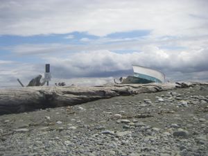 There is a one mile marker on the Dungeness Spit, but we used to use the beat up half of a dinghy that was right next to the official marker as our mile real marker. This time we spotted the official mile marker, but where was our dinghy? Our "rib cage", an old driftwood tree with spiking branches, was still there, but the dinghy had vanished. We took a closer look and found a few bits, but our dinghy's days as a landmark are over.