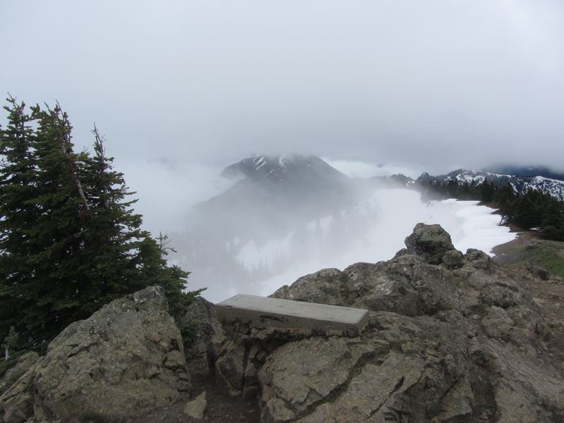 The summit of Hurricane Hill was surrounded by clouds. Our view degraded as we made our final ascent, scaring one poor marmot from his or her perch. Port Angeles and points north were invisible, hidden beneath the clouds. The entire north slope before us, sheltered from the sun, was covered in a thick layer of snow. It was quite dramatic.