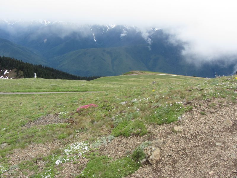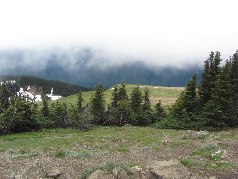 While we were exploring, clouds and mist were rising in the north, and by the time we were heading back, they had engulfed the top of Hurricane Hill. Through the mists we could see a blue lake forming from the melted snow and a golden marmot cooling him or herself on the snow.