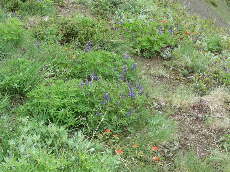 The lower reaches of the trail are lined with lupines, larkspur, paintbrush, turk's cap lilies and a host of others. The upper reaches are scented by patches of phlox. The middle range of the trail has yet to blossom, and the trailsides lined with green. We'll have to climb again and see how the alpine summer progresses.