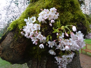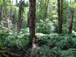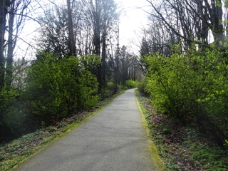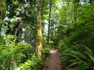 Now that spring is here, we've been hiking from Madison Falls up along the Elwha to the Altair Bridge. Most of the route follows Olympic Hot Springs Road, but the road is cut off by the river not far from the trailhead, so we take the detour through the hills around the old, now flooded, campground.
