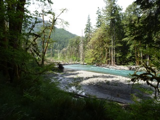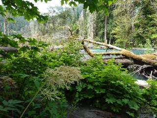 We took a short hike following the Elwha River from the Madison Falls parking lot, up and down the detour and then to Olympic Hot Springs Road. It's summer now, and the spring flowers are gone. The park people have been doing some work on the trail, making it wider at points and shoring it up. Meanwhile, the mules are back in town, and the Elwha River is roaring.