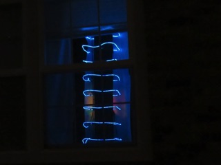 We have two new Halloween decorations for the house this year. There's the glowing skull, an Arduino based project that glows bright red, then dims to ashes, then glows fiery again. Every home needs one. We also put together a Jacob's ladder, the ultimate mad scientist accessory. This one uses electroluminescent wires. The photo doesn't do it justice. In life, the loops of electric arcs bursts upwards as it reanimates, well something.