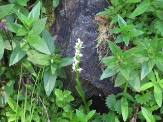 We've been trying to get back into climbing shape in hopes of being able to climb in the high country. We made it a little past the log bridge on the Lake Angeles Trail that starts near Lake Dawn. The spring flowers are about, but the special treat was, once again, frogs. There were the usual trilliums and violets and orchids, but also tiny little frogs perhaps the size of a fifty cent piece and large frogs over an inch log. They are very well camouflaged, but once you've spotted the first it is easier spotting the second, third and so on.