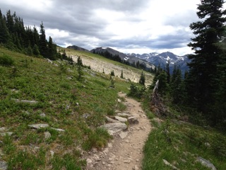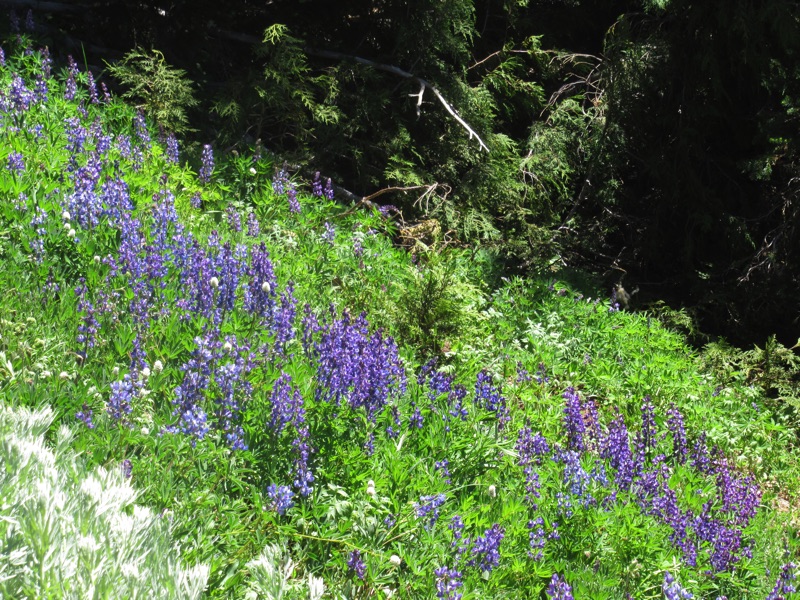 As it turned out, our plan worked. We rose early and were soon on the Skyline Trail heading up the slope with Mount Rainier and its streams and glaciers looming over us. It was a busy trail but beautiful. The flowers were blooming: lupins, mountain spiraea, bear grass and, inevitably, dirty sock plant. It was wonderful.