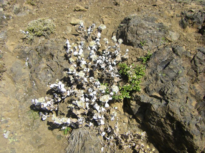 The flowers are heading towards autumn, with more asters, yarrows and possibly coreopsis. We wanted more, so we went for what one hiker called the "kick in the ass". We took the trail towards Lake Angeles, which heads up about 150 feet, before it begins its 2000 foot descent. This trail heads along the open ridge face for a ways, then it passes through "the gate", along a magic carpet of what appear to be frosted plants, and then through a second rocky "gate" to the high castle. This area is always slow to thaw and early to freeze, so here, the lupines lingered in masses among the eerie stones.