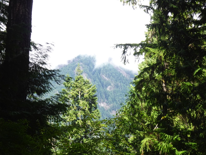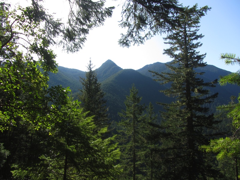 Hurricane Ridge Road is being repaired. We were planning to climb to Klahane Ridge, but the line at the park entry station ran back past the Lake Dawn turn off. It looked like a long wait, so we made a U-turn and headed out to Barnes Creek determined to climb something or another. What we wound up climbing was Storm King, the peak dominating the south side of Lake Crescent.