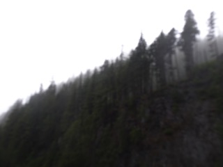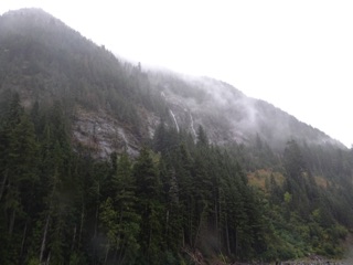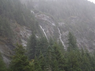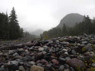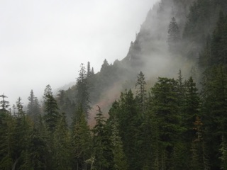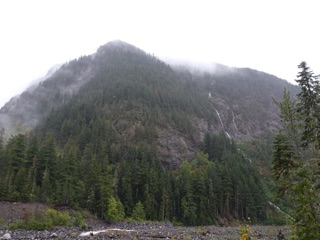 It was rainy on our most recent trip to Mount Rainier. It was snowing at the top, so we explored waterfalls instead of the high country. the Carter Falls walk took us down to a stony river bed with mists and hills and waterfalls above. We didn't get as close as at Nerada Falls, but we had a nice, cold, wet time exploring.