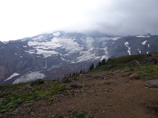 There were lots of hikers. Most were day hikers like us carrying a small pack or a bottle of water. Some were mountaineers with heavy packs and ice axes and clearly on their way to attempt climbing to the peak. There were quiet moments on the trail followed by hiking groups and family get togethers.