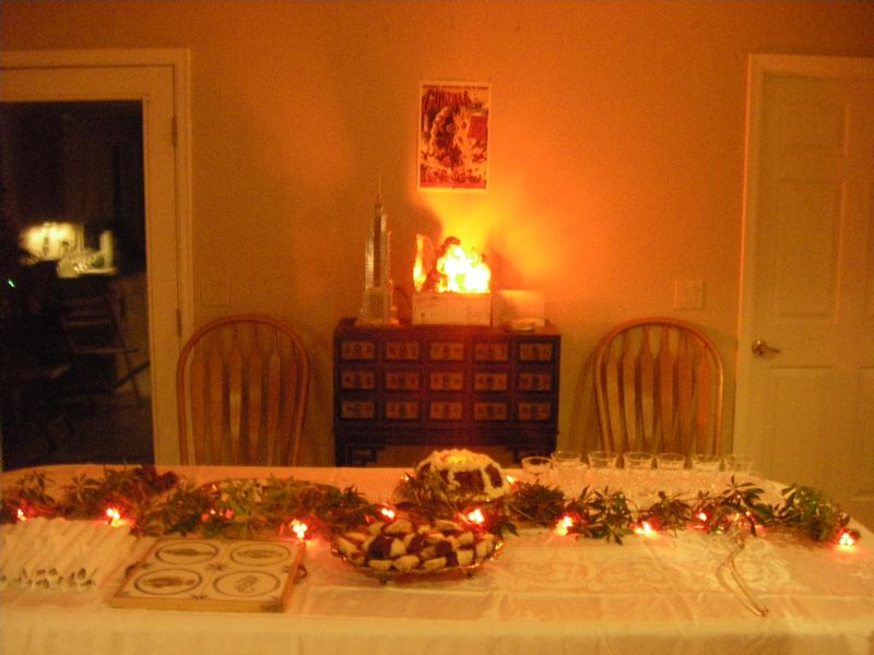 Our Godzilla Christmas angel was aglow with atomic fire. Our cookie tree aglow with candles, and our guests aglow with choucroute garnie, bourbon sodden fruitcake, brie en croute with cranberry chutney and, of course, our thermonuclear egg nog. It's the same recipe we use for Godzilla's atomic fire.