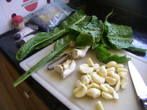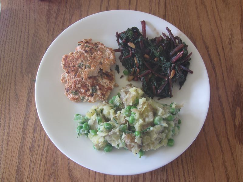 A market meal with salmon burgers, swiss chard and our favorite pea dish