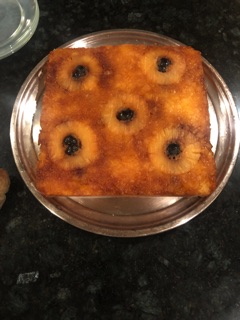 More recently, we decided to make our own version. We use Edna Lewis's caramel cake recipe for the cake and an improvised pineapple topping that starts on the bottom.