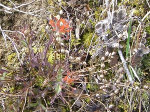 We have been rather desperate for signs of spring. Even in mid-April the temperature still drops into the 30s nightly, and there is fresh snow on the mountains. The landscape at Lake Crescent was barren, but we did see two local salamanders, undersized, but healthy as they basked on the muddy trail. To our surprise, there was some Indian paintbrush blooming on the descent just east of the bridge at the Devil's Punchbowl.