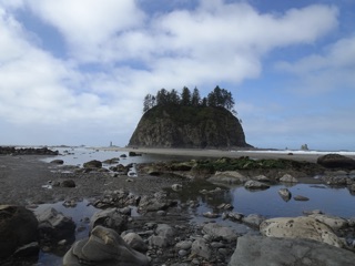 We were two hours before low tide, but it was a very low tide, so there was a lot of wet beach, gray and sparkling. The seastacks were as magical as ever. They almost seem impossible, or at least improbable, but there they are, remnants of an eroding shoreline, each with its own watershed and forested topping, an ecological island of fresh water surrounded by salt.