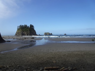 Second Beach is just south of La Push, and it's one of our favorite beaches. We took the 3/4 mile walk through the rain forest down to the beach. The trail was a bit muddy and the air still. As we approached the beach the air freshened, and we were greeted by the driftwood wall. There was a fair bit of driftwood, but a lot less than on our last visit. We had to climb, but a lot of the really big logs were washed back out to sea.