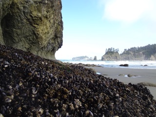The payoff was as wonderful as ever. The beach was broad, flat and firm. There was a bit of mist in the distance, but otherwise we had good clear views. We made our way south, avoiding the puddles of left over ocean and admiring the huddled star fish and anemones as we explored. It was pretty easy going. The beach had lots of sand, so it was easy getting to the little cave. We lacked the energy to go much farther, not really wanting to deal with the barnicle and seaweed encrusted rocks.