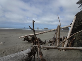 We were out at Second Beach around low tide on a gray day. We could smell the salt air as we descended to the beach from the rain forest. The driftwood pile at the beach was there, but it had changed since last autumn. The two big logs that formed the waterfront rampart were gone, presumably washed out to sea. The structure had changed in other ways as well. Our familiar clamber to the sea was gone. We had to figure out a new series of ups, downs, overs and alongs.