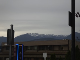 This was the view from the Safeway parking lot. There was snow on the mountains. It didn't last long, but it's another sign of winter coming. (Also shown, the electric blue trim on the electric car charger, another sign of things to come.)