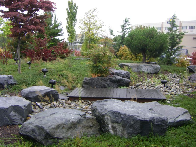 When we stay near Seatac airport in Seattle we often walk by a small vest pocket park on International Boulevard near 190th Street. There is a big Enterprise Rent A Car sign, a driveway and this park surrounded by a high metal fence. International Boulevard is the main airport strip, so it is mainly hotels, fast food restaurants, convenience stores, long term parking lots and the like. None of this is much to look at, but Enterprise has this peaceful looking little park, right on the main drag. In fact, their main operation is a half a block down that driveway, which might have something to do with this little park. Granted, we have never seen anyone in this park, and we can't figure out how to get in ourselves without the key or climbing the fence, but it still offers an oasis of calm and peace, right along the main frenetic drag.