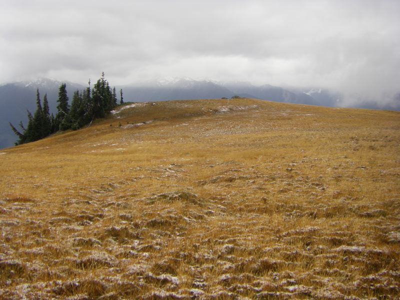 We could see fresh snow on the distant hills, but we didn't see much by the road side until we were at the Hurricane Ridge parking lot. The trees were frosted, but the road was clear. We headed on to Hurricane Hill, and we were rewarded for our persistence. This had been a wet summer, so the alpine vegetation was lush and the grasses higher and fuller. There had been a profusion of flowers. In September, temperatures started to drop, and the autumn colors came in. There were the golds and reds and browns. Now, an early snow had come, and highlighted all this rich color.