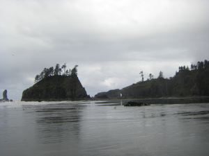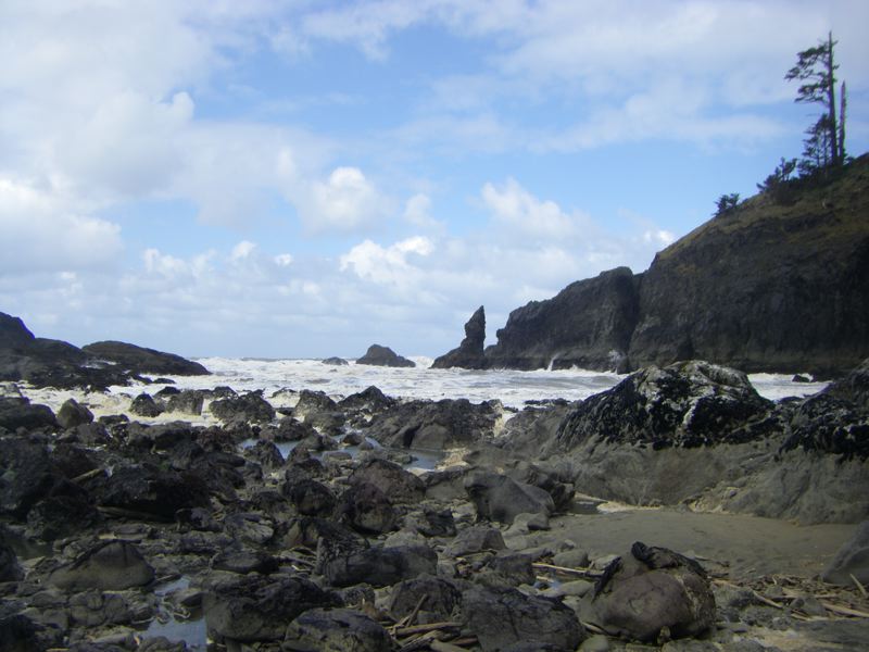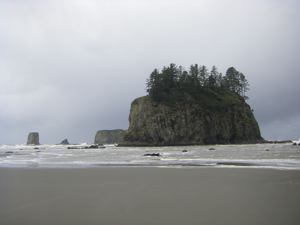 We'll start by apologizing for some of these photos not being quite level. The wind was just too fierce to hold the camera steady. That said, the scenery was pretty spectacular at Second Beach the other day. Even at low tide, the waters were wild, and the wind had the sea foam flying. We didn't even walk all that far down the beach. The winds from the south were just too much for us.