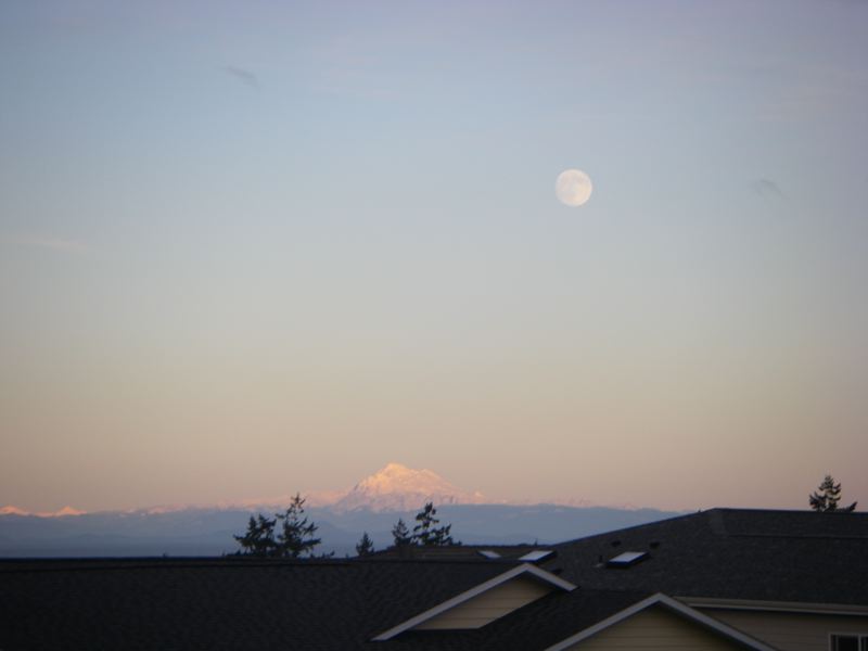 Here's another photo of Mount Baker, this one from our back yard. That's the waning moon before the eclipse that we missed, because we were sound asleep.