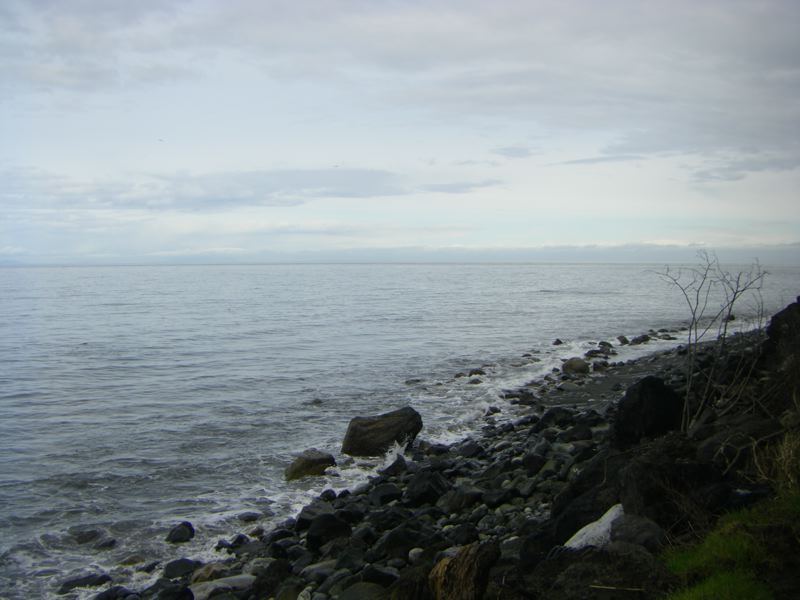 We often take the Olympic Discovery Trail from the parking lot off Four Seasons Road and head east towards Port Angeles. There are nice views and good bird watching along the waterfront parts of the trail, but the winter rains make the high bluffs above unstable. The waterfalls may be lovely this time of year, but it's the water that makes the bluffs crumble. We picked our way through this tumble of trees and mud, though sometimes we just regard it as a sign and turn back. Despite this hazard, it's a great trail for this time of year. When the sky is open enough it matters less that it is gray.