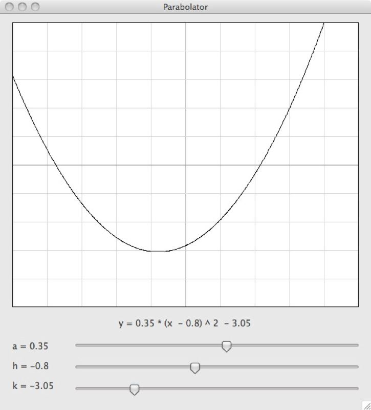 We've been tutoring some algebra, and we're up to quadratic equations. That means parabolas. We've thrown together a little program to explore parabolas by manipulating the parameters in the vertex form of the equation. If this means anything to you, download the program and play with it.