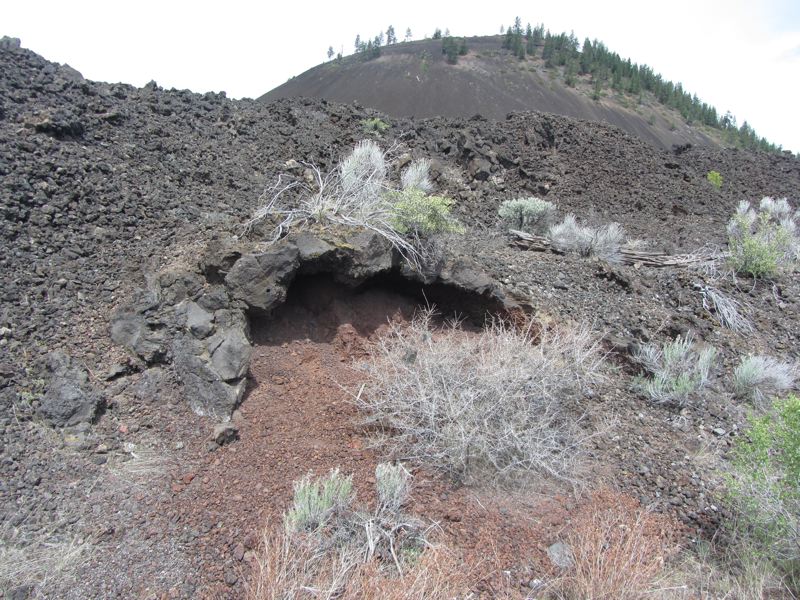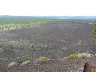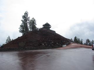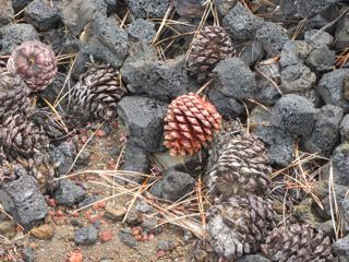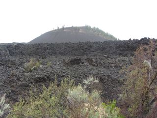 We were pondering plan B when a ranger popped out, apparently during a break in a training session, and suggested we try following the red road up the Lava Butte. We had noticed the butte towering darkly against a gray sky behind its wall of jagged and crumbled black lava. The red road was indeed red and while it was closed to cars, it was open to hikers, so up we went.
