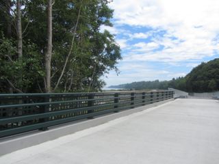 It's not really new. It opened back in February, but we finally made our way down along the waterfront to see the new bridge over Ennis Creek. It links the waterfront trail accessible from Railroad Avenue near the Red Lion in downtown Port Angeles and the rest of the Olympic Discovery Trail accessible from the parking lot near Morse Creek off route 101. It was actually possible to cross the creek before, but it required a detour inland. Now, one can head east out of town or west into town and stay along the waterfront.
