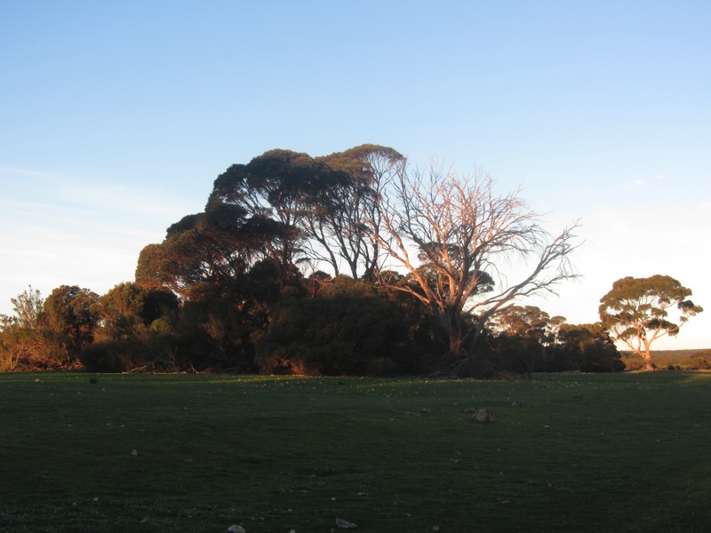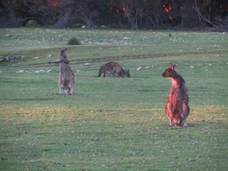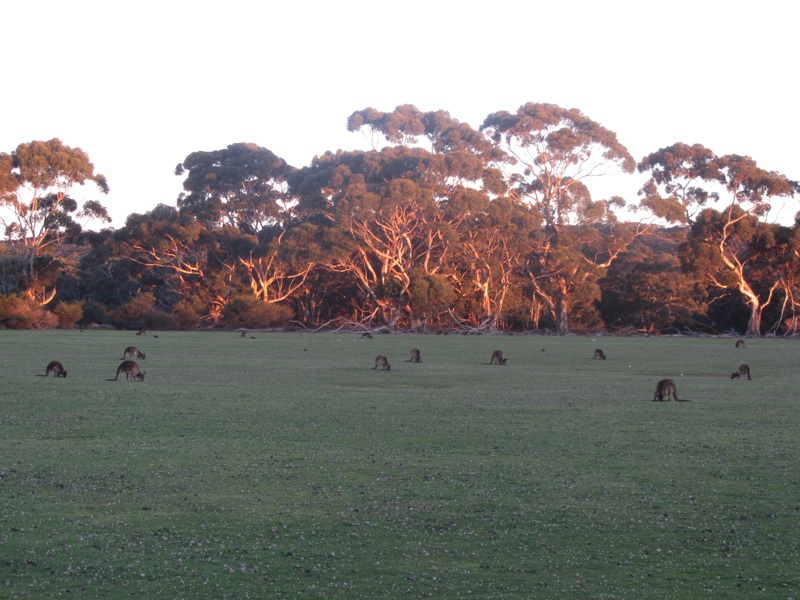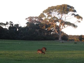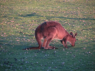 We took the Kangaroo and Canapes tour. It's less formally known as Booze and Roos. We took a shuttle bus to a field not far from the hotel. It was once a farm, cleared from the brush, but now home to enough kangaroos to launch a Volkswagen to the moon by sheer hopping power. The grass is cut as short as a golf green's, and the ground is covered with kangaroo by-product, but the kangaroos are calm even as we approach them.
