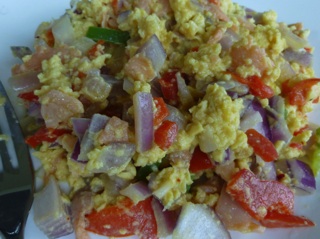 Our smoked salmon scramble with peppers (capsicums) and onions
