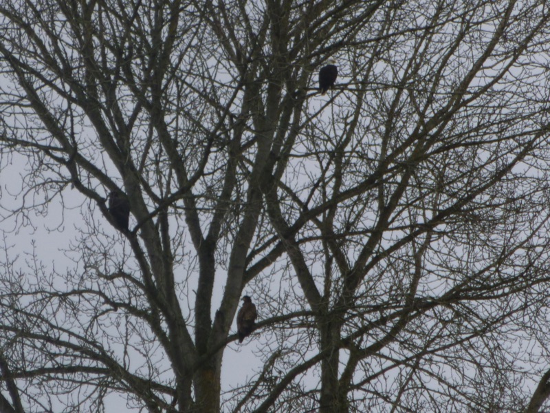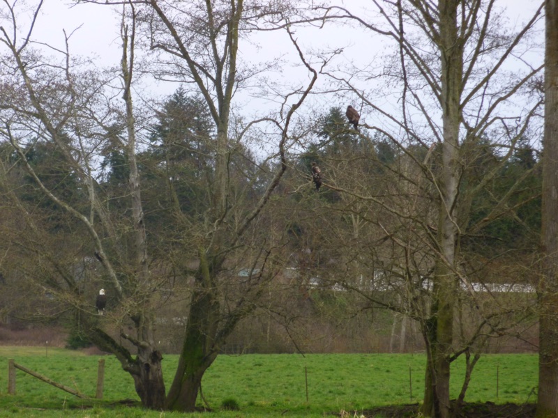 It’s eagle season, and one of the best places for spotting them is along the Dungeness Dike off of Towne Road in Sequim. It’s not a long walk, but it pays to keep your eyes on the sky and tree tops. The trail roughly follows the Dungeness River and borders a broad open pasture. Sometimes we see eagles flying high. Sometimes we see them perched on tree tops or flying above the river. There is a cluster of trees towards the south end of the fields that they particularly like. On our last visit, there were at least a dozen eagles perched there.