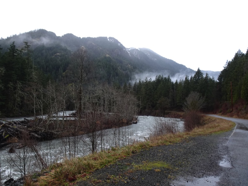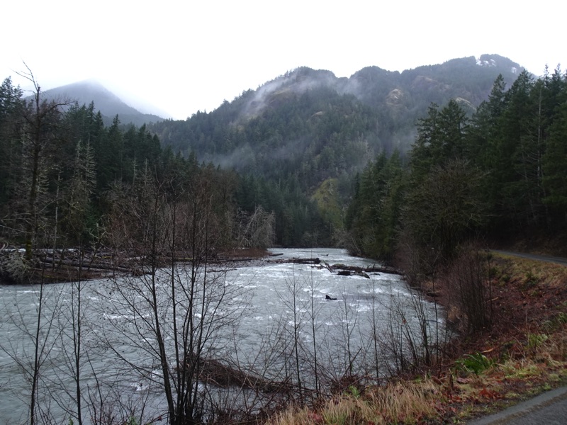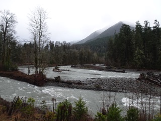 We went out to take a look at the Elwha River. We walked up past the mule camp, now closed for the season. We walked all the way up to where the road is completely washed out. Yes, the road is still closed. Still, it was pretty in a northwestern wintry sort of way.
