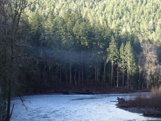 With all the recent rain, we wanted to check out the Elwha River. Now that it's a naturally flowing river and has severed Olympic Hot Springs Road, it's worth keeping an eye on. We chose a lovely sunny day and set out. There was still morning mist here and there, and the river was running nicely. Even at the stretch across from the Madison Falls parking lot, It was out of its summer channel. The mules at the mule camp were long gone.