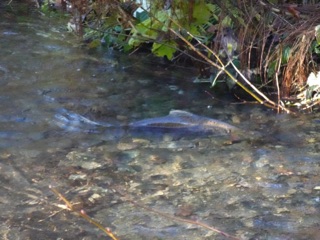 We did see signs of snow on the hills around us, and we had a wonderful view of the river from the Altair Bridge. On our way back, there was another surprise. Something was thrashing about in one of the side creeks. We took a better look, and there was a salmon struggling upstream, well late to the party.